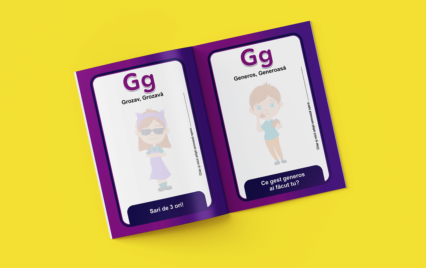 Pentru a include în pachet și o parte care să poată fii interactivă pentru copil fără supravegherea părinților, ca și activitate individuală, am creat cu ajutorul formulei de față a cartonașului un caiețel de colorat dimensiune A5. Spre deosebire de cărțile de colorat tradiționale însă, am ales să scădem opacitatea ilustrațiilor, pentru a indica culoarea și a crea o structură mai relaxată decât cea de contur negru pe alb.