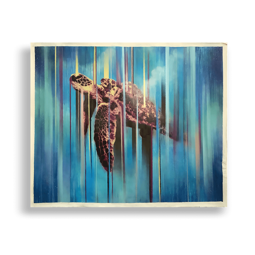 Această pictură a fost creată în 2022 și aduce în prim plan o țestoasă care, încercând să scape de schimbările majore asupra habitatului ei, incepe să „dea eroare” și să dispară treptat.